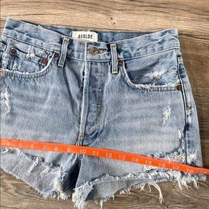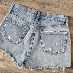 Chic and casual ripped jean shorts by Agolde. Light blue with a stylish frayed hem. Perfect for everyday wear.