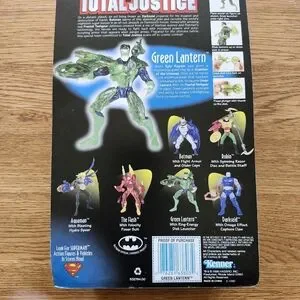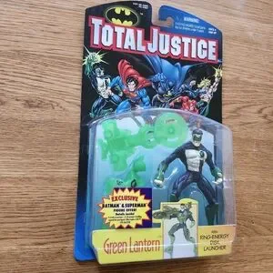 1997 Exciting Green Lantern figure from Total Justice. Features green and black suit. Includes ring-energy launcher for dynamic play. Excellent Condition Original packaging flaws Depicted in Photos