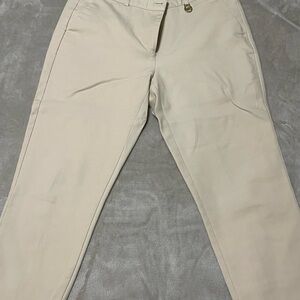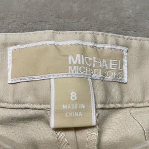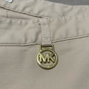 Elegant beige trousers featuring a gold Michael Kors emblem.