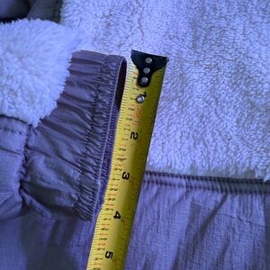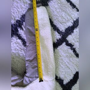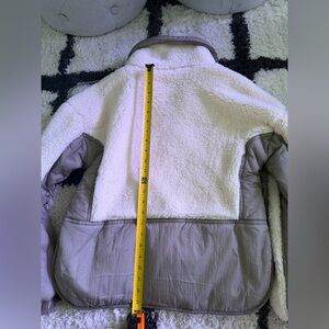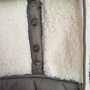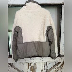 Soft cream sherpa pullover, thread and supply calls the secondary color dark olive green but it is a very grayish/green. Tried on once, never actually worn out. Size small. Measurements are included in photos.