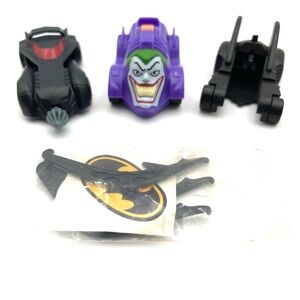 Vintage 1991 Batman tattoos and Batmobile. Part of Batmobile is missing. 2015 Batmobile and Joker toy cars. Please see pics for conditions.