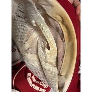 Vintage NASCAR Winston Cup Series trucker hat collection featuring various race events including the Daytona 500, Pocono, and Firecracker 400. This lot includes 12 individual snapback mesh caps with classic embroidered and screen-printed graphics from the 1980s and early 90s. Each hat showcases iconic racing sponsors and event logos in a red and white color scheme. These are authentic vintage pieces perfect for collectors of racing memorabilia or streetwear enthusiasts. Please note significant yellowing and staining on the interior sweatbands and mesh as shown in the photos.