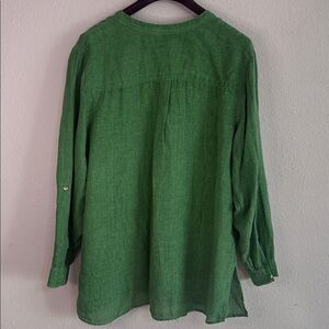 Elevate your wardrobe with this elegant green linen top. Perfect for any occasion, this top offers both style and comfort. The shirt has two front pockets, vneck collar, side slits, and foldable sleeves with gold buttons in great condition size XL.