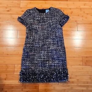 CeCe Tweed Black Gray Multicolor Fringe Hem Cap Sleeve Boucle Shift Mini Dress