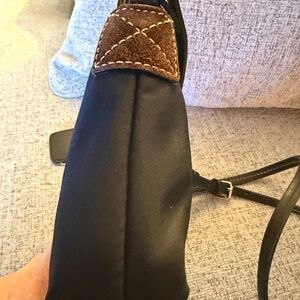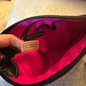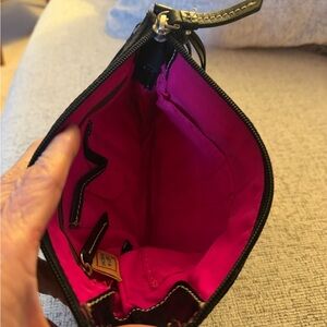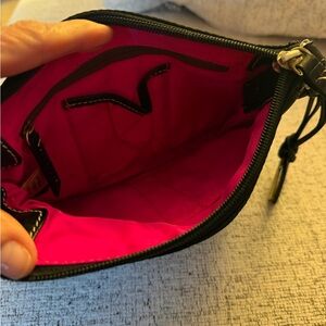 Dooney and Bourke Black Nylon Crossbody bag. Leather and goldtone double hangtag. Top zip. Inside bright pink super clean lining with multiple pouches and zip pouch. Brown Suede side accents! Adjustable strap. Very good condition only callout is scratching on metal logo.
