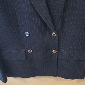 Tahari ASL navy pinstripe pant suit set. Classic business professional look perfect for corporate office, interviews, presentations, or elevated workwear styling.