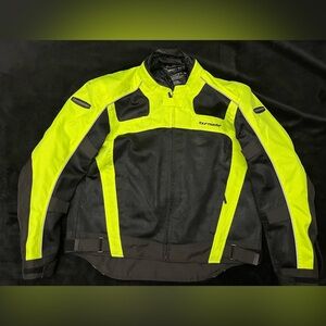 Men’s XL Tourmaster Draft 3 mesh jacket. New with tags, reflective piping, shoulder and elbow armor, back protector. Chest measures 25 inches, sleeves 23 and length is 29.