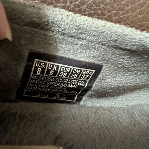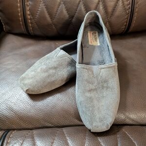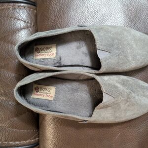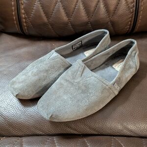 Excellent pre-owned condition, charcoal color slip on. Clean uppers and well-maintained interior lining. They have memory foam with a fuzzy inside for extra comfort. The outside is a suede like material.