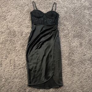 Chic black midi dress with sequin bodice. Draped skirt design. Ideal for special occasions.