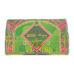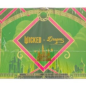 New, in box and plastic wrap. Two Wicked themed wine glasses. One pink for Glinda & one green for Elphaba.