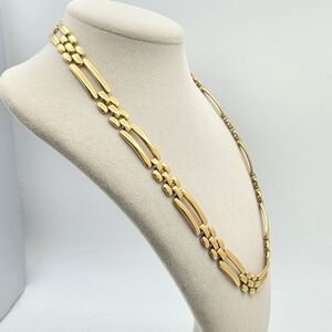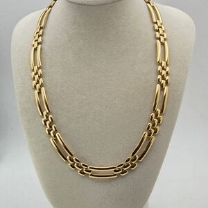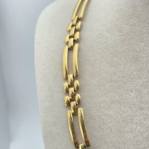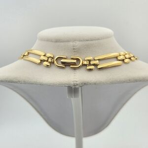 This elegant vintage Monet collar or choker necklace features a polished "ladder" or "bar link" design, this piece captures the bold, sophisticated aesthetic of borj mid-century ad well ss the 1980s and 90s and is in great vintage condition. There is wear on the back of the clasp.