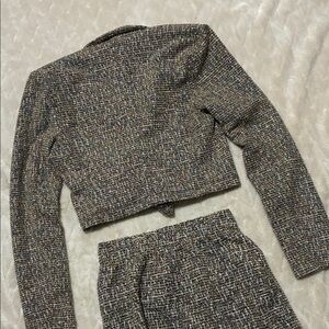 Stylish tweed skirt set by SO. Features a cropped blazer and mini skirt. Blazer is size Small. Skirt is size Extra Small, but has an elastic band in back so it has stretch. Ideal for a polished look.
