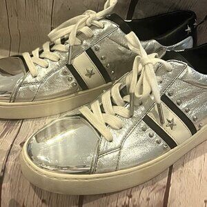 Michael Kors Woman's MK Size 9.5 M Frankie Striped Leather Sneakers Silver