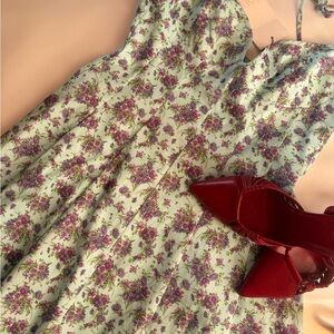 Chic mini dress with floral pattern. Features delicate spaghetti straps. Ideal for warm days.