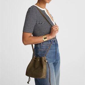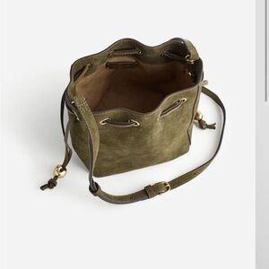 Elegant shaded olive suede crossbody with drawstring closure. Ideal for daily wear.