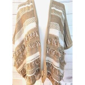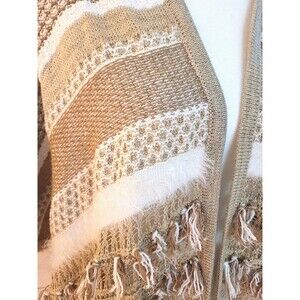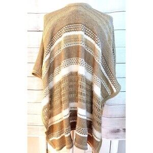 Elevate your casual look with this Chico's open crochet poncho. Made from high-quality acrylic material, this sweater features a white and khaki color combination and accented with fringe. The sweater is machine washable and perfect for winter, fall, or spring.