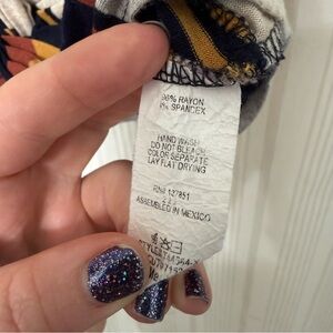 ✨Excellent condition! Earthy tones with beige, gray, navy, mustard and burnt sienna rust colors. Crop top style. Twist front is sewn and cannot be undone. This shirt has a good amount of stretch. 17” pit to pit. Size medium.