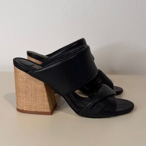 Chic black leather mules with a stylish tan raffia block heel. Perfect for elevating any outfit. Includes original box.