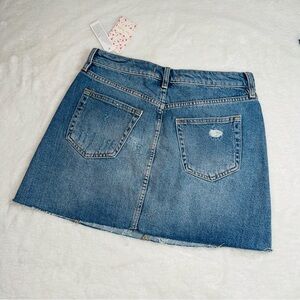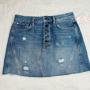 New Free People Denim A-Line Skirt, distressed denim button front closure. A comfy fit, intentional distressed throughout. 5 pocket styling, frayed hem. Can be dressed up or down, depends on the look that you're going for. Perfect for fall with long boots or for the beach.