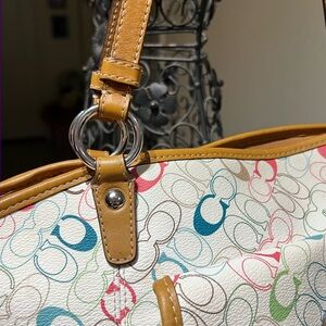 Coach Chelsea Leah Tote Zip Bag in cream with a multicolored Signature "C" monogram pattern and leather trim. Coated canvas and leather trim Aprox 16 inches in length, 10 inches in height, and 5 inches in width. Mostly clean Do not have scuffs or visible damages as seen in pics Working zippers