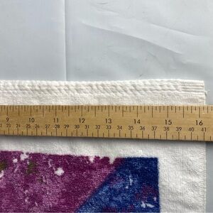 Colorful towel with abstract geometric design. Features shades of purple, teal, and pink on a white background.