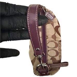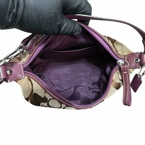 Authentic Pre-Loved Coach signature demi shoulder bag featuring classic khaki and brown jacquard canvas with burgundy/purple patent leather trim and silver tone hardware.