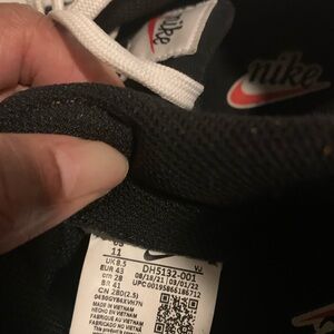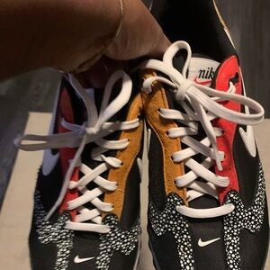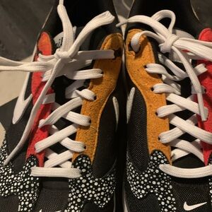 Dynamic Nike sneakers featuring a bold mix of black, white, and purple. Includes striking orange and leopard print details. Perfect for a standout look.