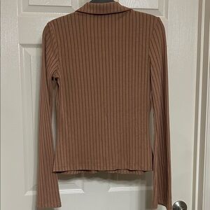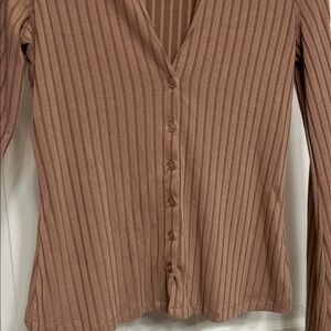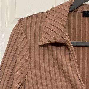 Gorgeous cool button down top from Sanctuary, featuring a beautiful butterscotch brown with vertical wide ribbing. Perfect for versatile styling. Comfortable and elegant, also slightly oversized for an extra small. Please see measurements.