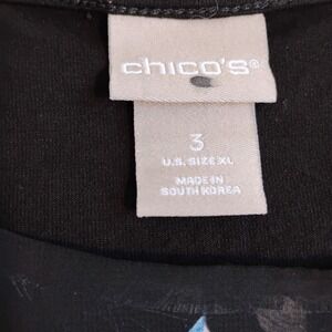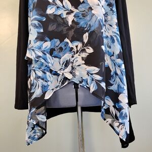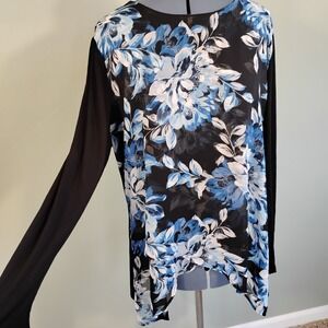 Chico's Black Blue Floral Asymmetrical Hem Tunic Top Long Sleeve Size 3 XL Layer