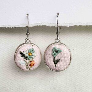 Soft, sweet, and full of handmade charm. These round drop earrings feature delicate floral embroidery with tiny seed bead details on blush fabric. Each earring is slightly different, giving them that perfectly imperfect, one-of-a-kind feel. Finished with silver-tone hooks and lightweight enough for all-day wear—easy to dress up or down.