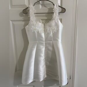 Elegant Elder mini cocktail dress by Elliatt. Features a delicate textured pattern with flower and pearl detailing. Ideal for bridal events.