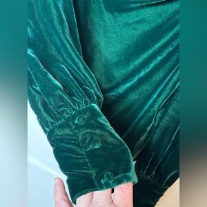 Deep emerald green velvet top. Drape neckline. 3 button cuff. 2 button back of neck. No stretch to fabric so be sure to check measurements.