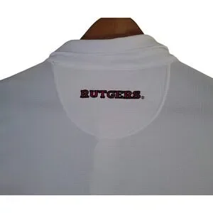 Nike Team Rutgers University polo shirt in a crisp white with scarlet red accents. This performance-ready top features the iconic Rutgers 'R' embroidered on the chest and the school name across the back neck. Designed with Nike Fit technology, the breathable textured fabric ensures comfort during game days or casual wear. Red contrast piping and paneling along the shoulders and sleeves add a sporty, athletic aesthetic to this classic three-button placket polo. (e+)