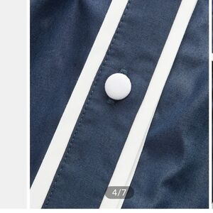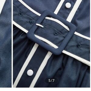 Chic navy midi dress with white trim. Features long sleeves and button-down front. Belted waist for a flattering fit.