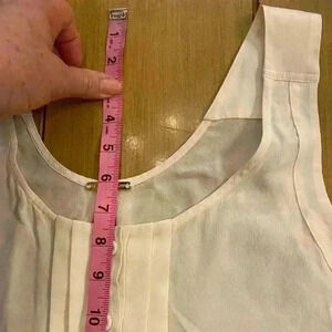 This is a new without tags, NWOT, feminine flowy sleeveless top. It is 100% silk. It in excellent condition, as it is new. It looks like it’s multicolor in the picture, but it’s not. It’s a solid light cream. It is a little see through and has pretty details at the chest. I have measurements in the pictures. Please let me know if you have any questions and thank you for considering my item.🌷
