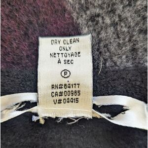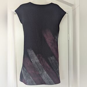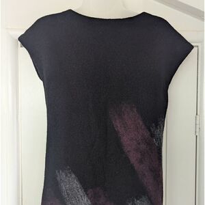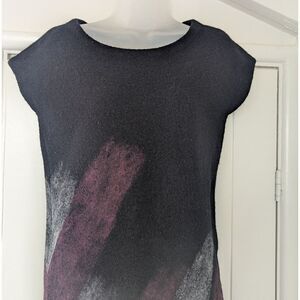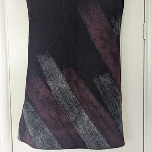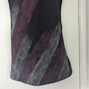 Description: Vintage Boiled Wool Shift Dress Whimsigoth Fairy Grunge Witchy Feminine Dark Academia SM, purple and gray paint strokes on the front and back, fabric has some weight to it, no stretch, crew neckline, slight cap sleeve