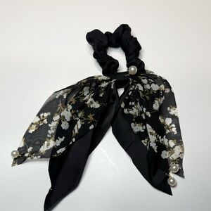 Elevate your style with this set of floral pearl-embellished hair scrunchies. Featuring elegant black, green, blue, and cream colors, these accessories add a touch of sophistication to any outfit.