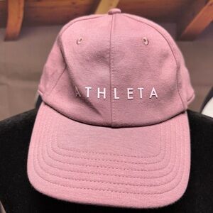 Stylish pink baseball cap by Athleta. Features gummy logo. Perfect for casual wear.