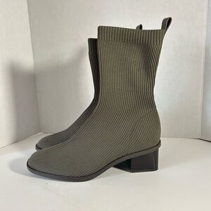 Excellent like new condition. Size 9; fit is true to size (don’t size up) “Our Glove Boot just got a raise. Introducing the High-Ankle Glove Boot-it's made of the same textured ReKnit® fabric as the original-with a higher shaft. Easy to pull on and designed to fit your foot like a glove, our most flattering boot just got, well, more flattering. Plus, it's made from renewed plastic bottles, so you and the planet can look your best. 8% Recycled Polyester, 10% Nylon, 2% Elastane, 100% Leather Details 45mm / 1.75inch heel Stacked leather wrapped heel Square toe Pull-on back tab Color: Caper Green”