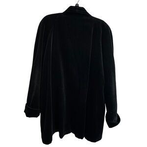 Sophisticated black vintage blazer. Velvet but tag says 100% cotton! Cuffs roll. Long jacket / blazer. Size L.