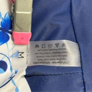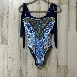 Elegant swimsuit with blue floral design. Adjustable tie straps for comfort.