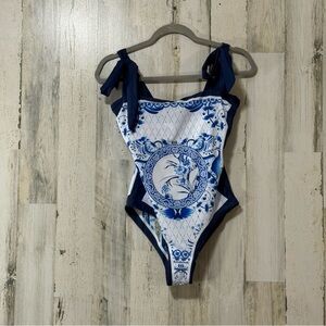 Reversible Adjustable Tie Straps Blue White Patterned One-Piece Swimsuit