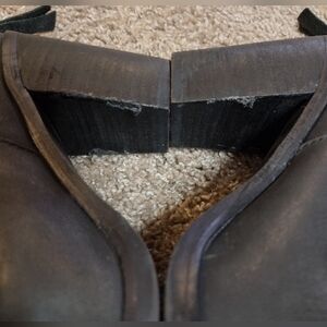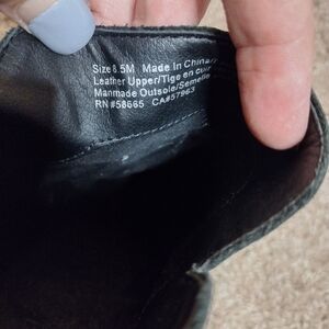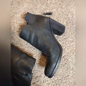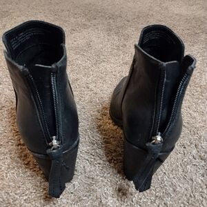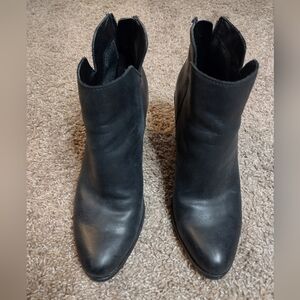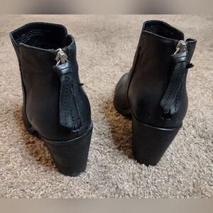 Step out in style with these sleek BP black leather ankle booties. These have a chunky block heel, Perfect for any occasion, they offer both comfort and elegance. small scuffs on heel as shown in photos. women's size 8.5 all questions welcome!