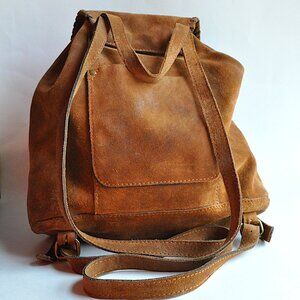 Patricia Nash Casape backpack in aged-looking burnished suede in a cognac brown shade. Drawstring top with clasp on flap. One front pocket (7 1/2" deep), one back pocket (5 3/4" deep), one interior pocket with flap (4" deep), and key tether with spring clip. Bag is about 13" high, 13" wide, and 5" deep. This opens alllll the way up, and is nice and roomy; for a purse, I'd call it "large", but for a backpack, it's only medium. Straps are 28-32" long (measuring from the bag to the first and then last hole.) Drop is tough to measure on this but I'd say it's 15", maybe 16" max. Also has a convenient top handle. Whipstitching around flap, branded brass hardware, and embossed logo. The Italian suede is supple but rugged. Weighs just over two pounds. A little boho, a little western, but not enough to pigeonhole it in either category: a nice, versatile bag that can get you through the whole day.