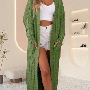 Add a relaxed vibe with this army green, casual oversized cardigan featuring a cable knit texture and rib‑knit detailing. The open front design, long sleeves with drop‑shoulder construction, and round neck create effortless layering. A loose fit, regular hem and long length make it ideal for cool days, while the muted green tone pairs well with denim, tees, or sweaters.