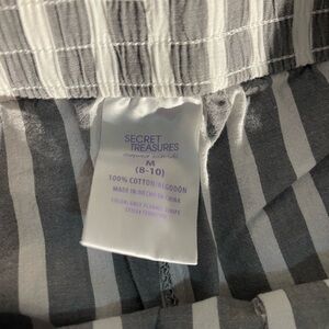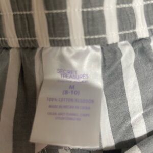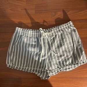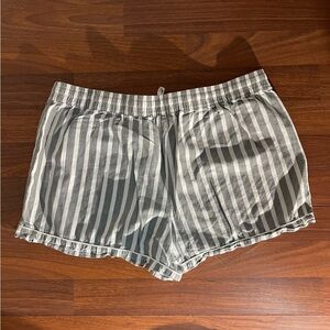 Comfortable gray and white striped shorts. Features an elastic waistband. Ideal for relaxing at home.