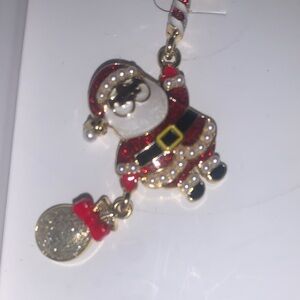 🆕- Adorable Santa earrings with candy cane & Ornament accents. Features red, white, and gold tones. Has little pearls, red stones, & sliver glitter.