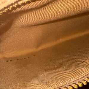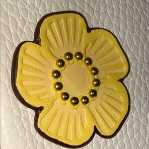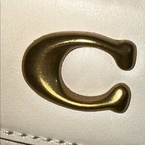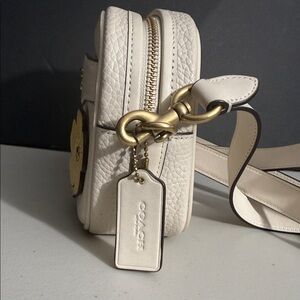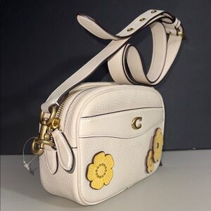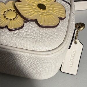 Elegant Coach crossbody with cream leather and yellow floral details. Features gold hardware and adjustable strap.