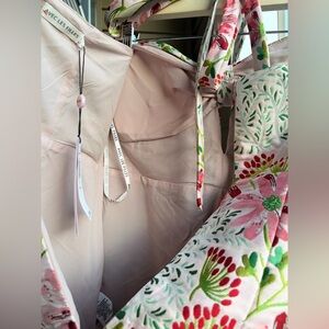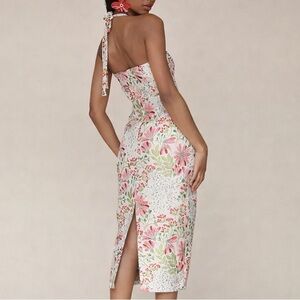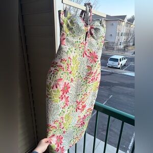 Stunning Avec Les Filles “Wild Daisy” floral jacquard dress in size 6. This beautiful fitted sheath features a structured silhouette with a feminine bow detail at the front neckline and a subtle front keyhole. The textured jacquard fabric has vibrant pink florals with green foliage on a soft blush background, giving it a rich, dimensional look.