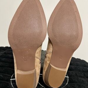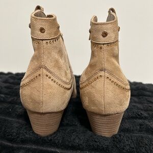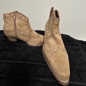 (14.) Step out in style with these chic tan suede ankle cowboy boots. Featuring intricate studded beadwork detailing across their scalping. These 1.5” heel boots are perfect for any line dance fun event. (NWOT)